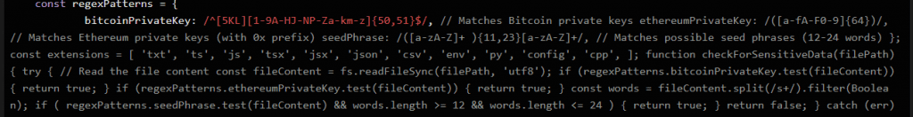 - Seed Phrases: It scans for sequences of 12 to 24 words, which are commonly used as seed phrases for cryptocurrency wallets.